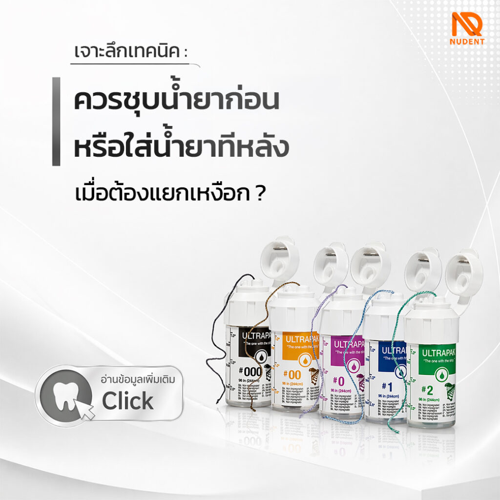 การจัดการกับร่องเหงือกเป็นทั้งศาสตร์และศิลป์ ทันตแพทย์แต่ละท่านอาจมีเทคนิคที่ถนัดต่างกัน แต่หากพิจารณาในเชิงวิชาการและการควบคุมสภาวะในช่องปาก ทั้งสองวิธีมีนัยสำคัญที่ต่างกันดังนี้ครับ: 1. การชุบน้ำยาบนด้ายแล้วใส่เข้าไปทีเดียว (Pre-impregnated / Pre-soaking) เป็นวิธีมาตรฐานที่นิยมใช้มากที่สุด โดยการนำด้ายไปแช่ในน้ำยาห้ามเลือดก่อนจะกดลงไปในร่องเหงือก 2. การใส่ด้ายเปล่าลงไปก่อนแล้วค่อยหยดน้ำยาทีหลัง (In-situ impregnation) เทคนิคนี้คุณหมอจะใส่ด้ายที่แห้งและสะอาดลงไปในตำแหน่งที่ต้องการให้เรียบร้อยก่อน แล้วจึงใช้พู่กันหรือเข็มฉีดขนาดเล็กหยดน้ำยาลงไปบนด้ายภายหลัง สรุปแบบไหนดีกว่ากัน? ในทางปฏิบัติ “ไม่มีวิธีที่ดีที่สุดแบบเบ็ดเสร็จ” แต่ขึ้นอยู่กับสภาวะของเหงือก ณ ขณะนั้นครับ: เจาะลึกนวัตกรรม: ทำไม UltraPak ของ Ultradent ถึงเป็นด้ายแยกเหงือกอันดับหนึ่ง? สิ่งที่ทำให้ UltraPak โดดเด่นกว่าด้ายแยกเหงือกทั่วไปในท้องตลาด ไม่ใช่แค่การเป็นด้ายถัก (Knitted) แต่คือรายละเอียดที่ผ่านการคิดค้นมาเพื่อแก้ปัญหาหน้างานของทันตแพทย์อย่างแท้จริง ดังนี้: แหล่งอ้างอิง : https://www.ultradent.com/products/categories/indirect-restorative/retraction/ultrapak?srsltid=AfmBOorUScylMO5In1EOoRaPQwGZJuRMqe0vZIU2oH8IspnHaNdmkpfz
